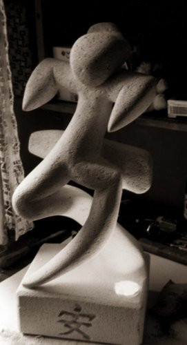 Modélisation d'un sigle chinois en 3D. ce sigle signifie la Paix, le calme, et a donc été modélisé par un petit bonhomme appuyé sur un morceau de branche ou de banc.