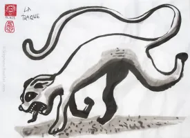 - peindre: là c'est votre style qui va dicter et faire voyager votre pinceau, mais gardez à l'esprit trois particularités: d'une part, on tient le pinceau assez verticalement, mais on peut appliquer avec le pinceau divers types de touches: touches pleines (verticales, noires), des touches étalées (mouvement latéral d'un pinceau penché: un coté bien noire et précis, un coté un peu dilué), des touches en pointillées (cf le sol de La méditation du panda) et des touches en volutes (poser + tourner sur lui-même un pinceau assez sec / cf barbe de L'esprit tentaculaire). D'autre part, on peut appliquer l'encre sur un papier sec ou mouillé, de même que l'on peut ajouter de l'eau (rapidement) pour diluer les bords d'un trait. Enfin, on peut diluer l'encre de Chine afin de faire autant de nuances de gris que l'on souhaite, et là, c'est vrai que les godets en porcelaine, ou la marguerite, sont tout simplement géniaux.