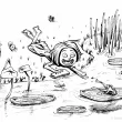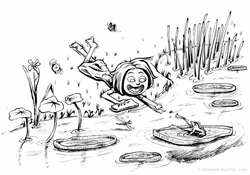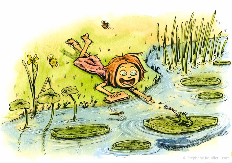Une jeune fille découvre la faune et la flore des rivières, grâce à un petit manuel. Elle tend son doigt vers une grenouille sur un nénuphard, alors qu'une libellulle et des papillons lui volent autour. Dessin de couverture (essai) pour le livre "Petit manuel de la rivière" aux éditions "La Cheminante"