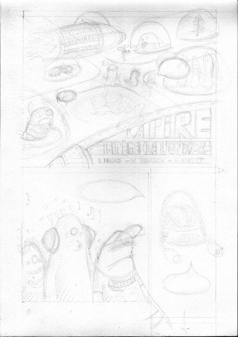 Je mets également deux pages de crayonnés: on voit que j'ai ouvert les cases de la page 1 vers le bas et vers le haut. La page 2 a quand à elle été modifiée en éclaircissant le fond noir pour la version colorée.
