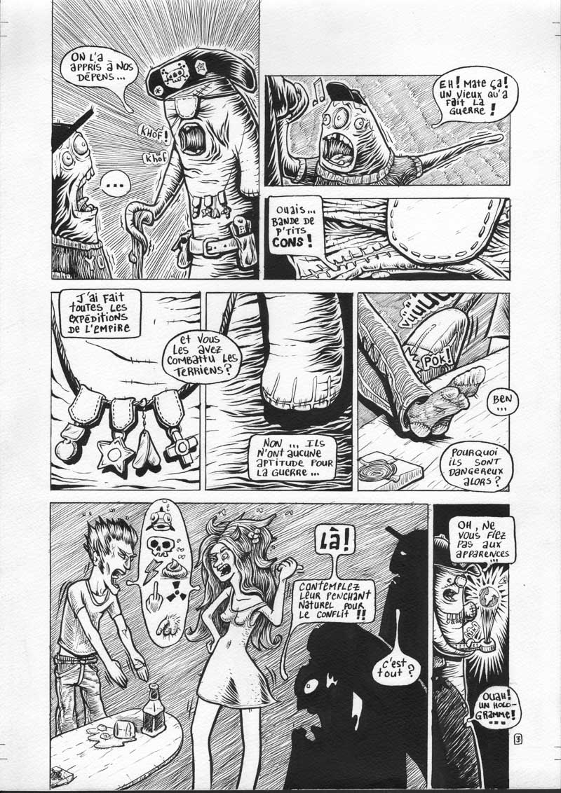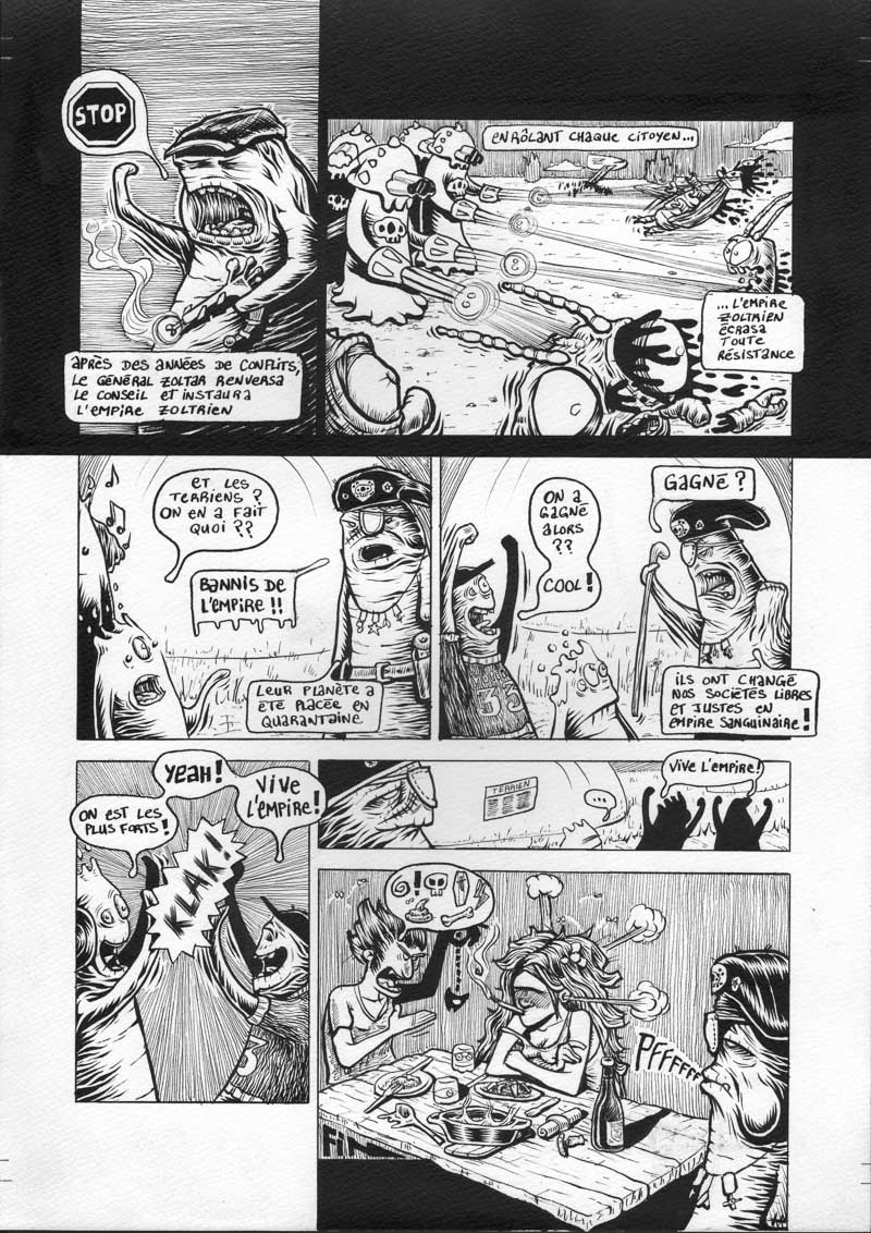 Cette BD a été colorée sous Photoshop pour la publication: voir la version couleur. C'est une de mes premières BD absorbant les codes du manga dans les tailles des ellipses (espaces entre les cases) et les cases à fond perdu du haut et du bas, donnant au final des pages à lecture assez verticale.