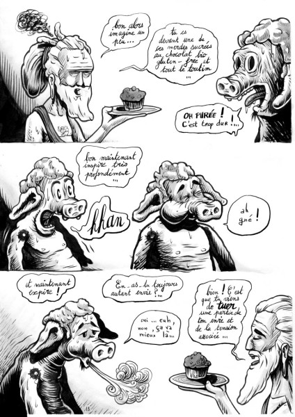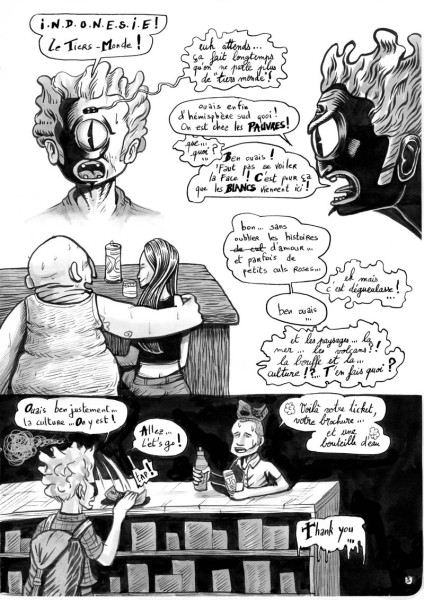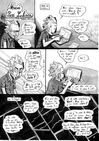 Par S. BOUILLET, 2 mars, 2018 Publié dans Bande dessinée & Manga Créé avec Encre de Chine A4 (±21 x 30 cm) Papier Moleskine Visite du musée Puri Lukisan à Ubud, ville remplie d'hippies en jupette courte, et de gâteau gluten free… NB : ne cherchez pas le chapitre #1, il sera publié dans un prochain Beta ! Voir plus de Indonesia (BD) Acceptation Alimentation Ballonement (digestif) Bonheur Drogue Envie Garuda Gâteau Indonésie Instinct Musée Puri Lukisan Obésité Stress Sucre Ubud (Indonésie) Voie du milieu Beta #8