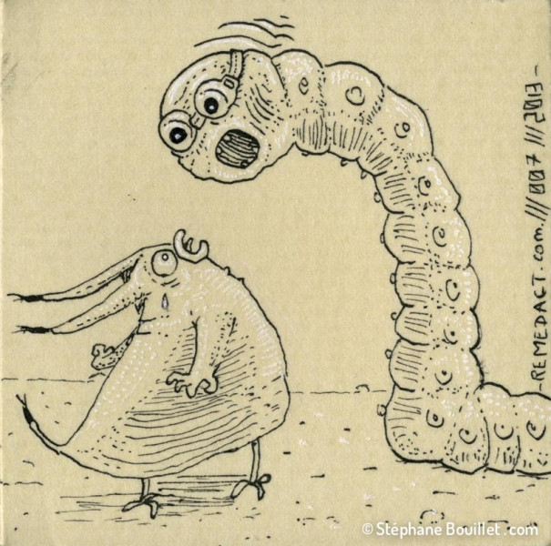 Par S. BOUILLET, 26 octobre, 2013 Publié dans Illustration Volume Créé avec Encre de Chine Plume Encre blanche Carré (± 8 x 8 cm) Boite L'exquis Q.I. face à une chenille géante Q.I. est une des mascottes du fanzine Linkult, un piaf genre canari japonisé, pas très malin, quoique... Quand les rôles de prédateurs / proies sont inversés Voir plus de Animal Boite à fromage Chenille Insecte Lunettes Oiseau Peur Q.I. Sasabudi Illustration jeunesse