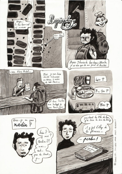 Ça y est ! Ouf ! Enfin !! Après 3 mois de trip et 1 mois de squat en Franche Comté, les premières planches de mon trip aux Philippines, après le trip au Japon, voient le jour ! Autrement dit, je les ai encrées : effectivement, pendant le trip je ne faisais "que" le scénario et la mise en page, autrement dit le crayonné, ce qui permet de dessiner en étant fraichement imprégné des influences du voyage. Je remettais l'encrage à plus tard car pas le temps de voyager et d'encrer... en tous les cas pas avec mon niveau et ma technique actuelle. Tout cela va changer un de ces quatre je l'espère mais ne nous leurrons pas : la bande dessinée est un art (ou pas) qui prend du temps !