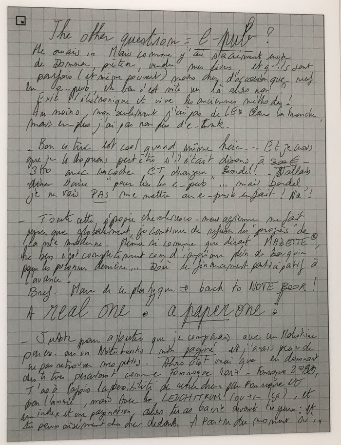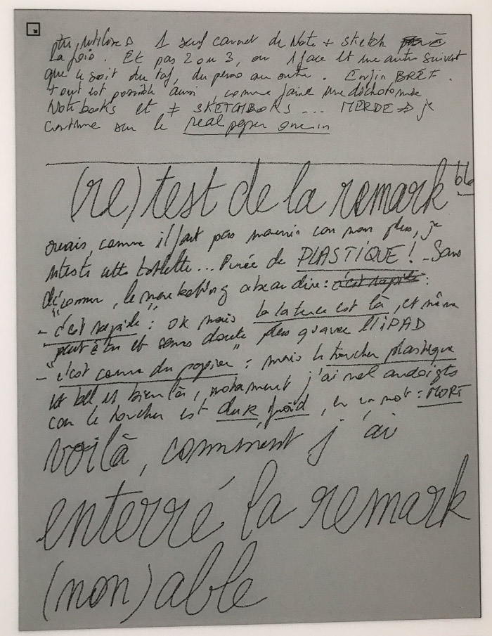 Ce point de vue est aussi valable pour la prise de note : avec la remarkable, je suis libéré d'un coté, avec le retour en arrière + l'effacement à disposition + un nombre de page illimité, mais du coup je blablate davantage que sur un carnet papier à la place limitée ; je parle pour ne rien dire, je dessine davantage à l'arrache, je m'applique moins, comme si le dessin, les notes, avaient moins de valeur. Avec le numérique et la remarkable, je crée du jetable. Et c'est certainement un des drames de notre société actuelle.