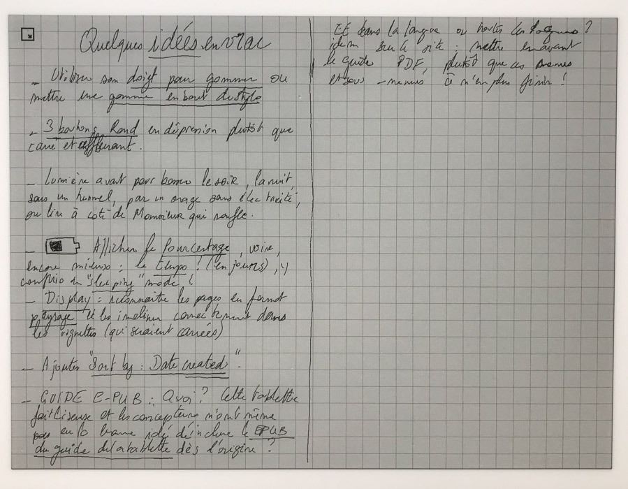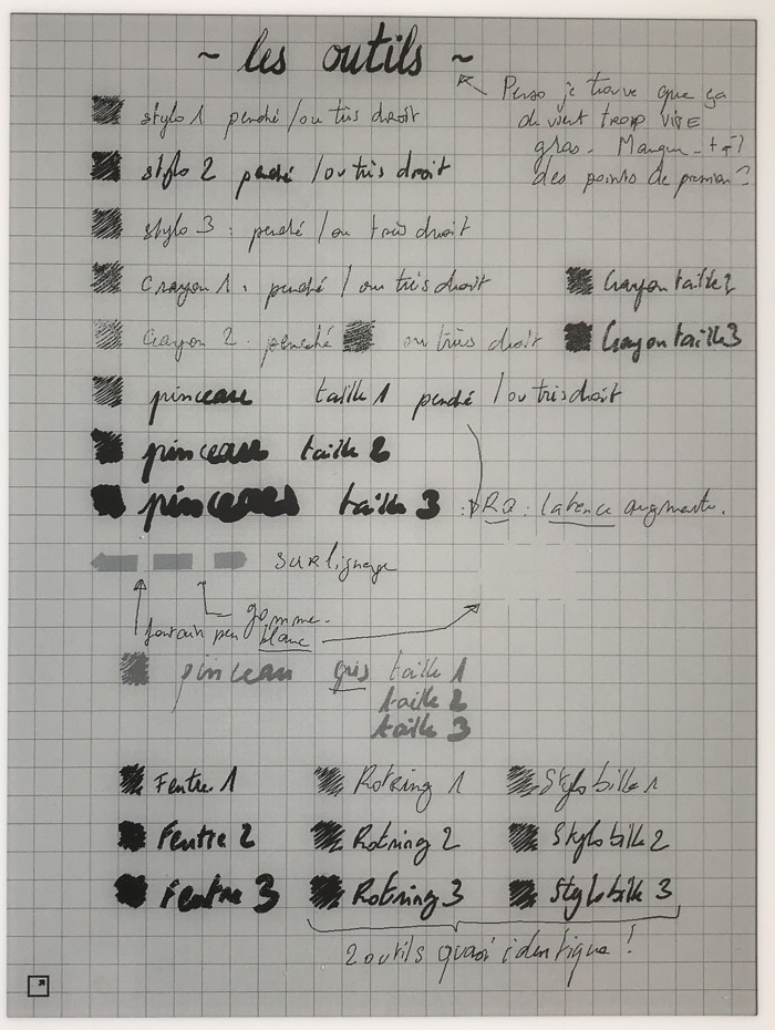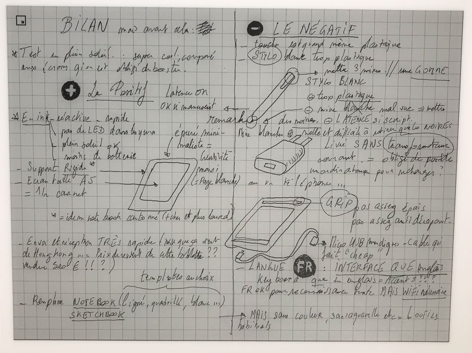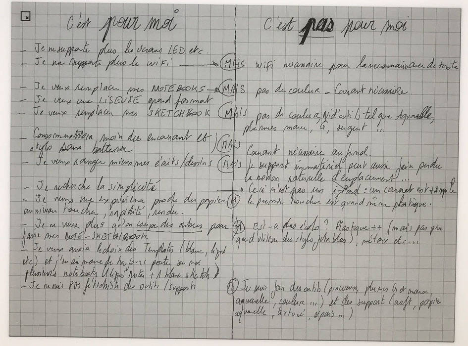 - j'en ai marre des écrans : dans ce cas un notebook / sketchbook / feuilles volantes sont parfaits. Un enième écran, fut-il e-ink et sans éclairage, ne réponds pas à ce problème. C'est une alternative, certes, mais trop onéreuse et présentant trop de défauts.