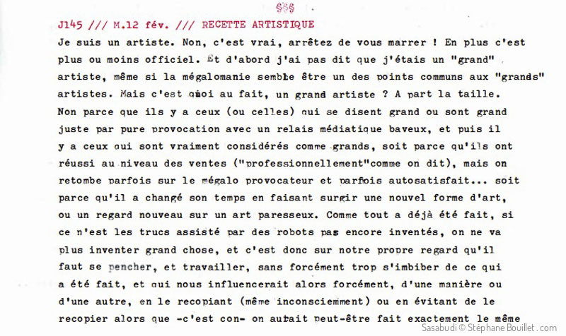 Je suis un artiste. Non, c'est vrai, arrêtez de vous marrer ! En plus c'est plus ou moins officiel. Et d'abord j'ai pas dit que j'étais un "grand" artiste, même si la mégalomanie semble être un des points communs aux "grands" artistes. Mais c'est quoi au fait, un grand artiste ? À part la taille. Non parce qu'ils y a ceux (ou celles) qui se disent grandq ou sont grands juste par pure provocation avec un relais médiatique baveux, et puis il y a ceux qui sont vraiment considérés comme grands, soit parce qu'ils ont réussi au niveau des ventes ("professionnellement"comme on dit), mais on retombe parfois sur le mégalo provocateur et parfois autosatisfait... soit parce qu'ils ont changé leur temps en faisant surgir une nouvel forme d'art, ou un regard nouveau sur un art paresseux. Comme tout a déjà été fait, si ce n'est les trucs assisté par des robots pas encore inventés, on ne va plus inventer grand chose, et c'est donc sur notre propre regard qu'il faut se pencher, et travailler, sans forcément trop s'imbiber de ce qui a été fait, et qui nous influencerait alors forcément, d'une manière ou d'une autre, en le recopiant (même inconsciemment) ou en évitant de le recopier alors que -c'est con- on aurait peut-être fait exactement le même truc. Une idée peut-elle être vraiment breuvetée ? Comme si sur 6 ou 7 milliards de personnes, aucune autre n'allait avoir la même... Stupide !