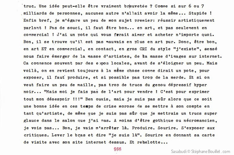 Enfin bref, je m'égare un peu de mon sujet premier: réussir artistiquement parlant ! Pas de souci, il faut être bon... en art, et pas seulement en commercial ! J'ai un pote qui vous ferait aimer et acheter n'importe quoi. Bon, il se trouve qu'il est pas mauvais en plus en art pur. Donc, être bon, en art ET en commercial, en contact, en gros CRI du style "j'existe", sensé nous faire émerger de la masse d'artistes, de la masse d'images sur internet. Ça commence souvent