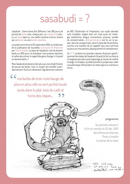 RAPPEL: Sasabudi - Same Same But Different, c’est 365 jours de pousse de barbe avec, chaque jour, un autoportrait photo, un texte tapé sur une vieille machine à écrire, illustré par un dessin ou une bande-dessinée.