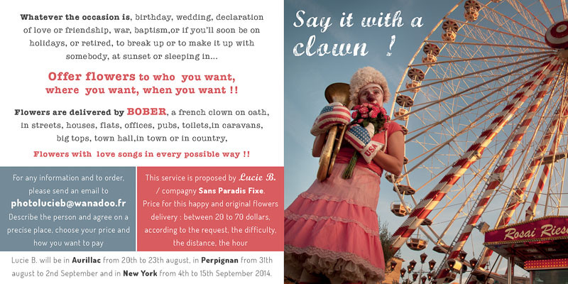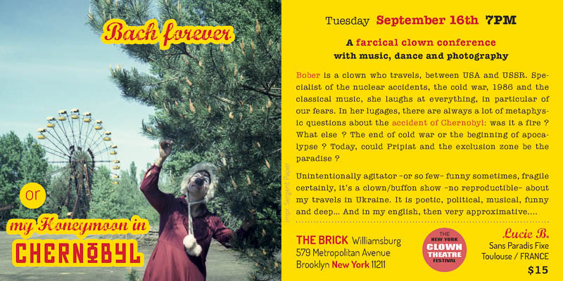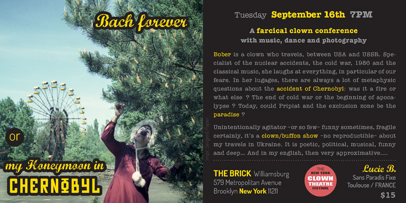 * RECTO Flyer "Bach forever - or my honeymoon in Chernobyl" "Bach pour toujours, ou ma lune de miel à Tchernobyl" Festival de clown de New York - septembre 2014 * VERSO Say it with a clown ! Dites-le avec un clown !