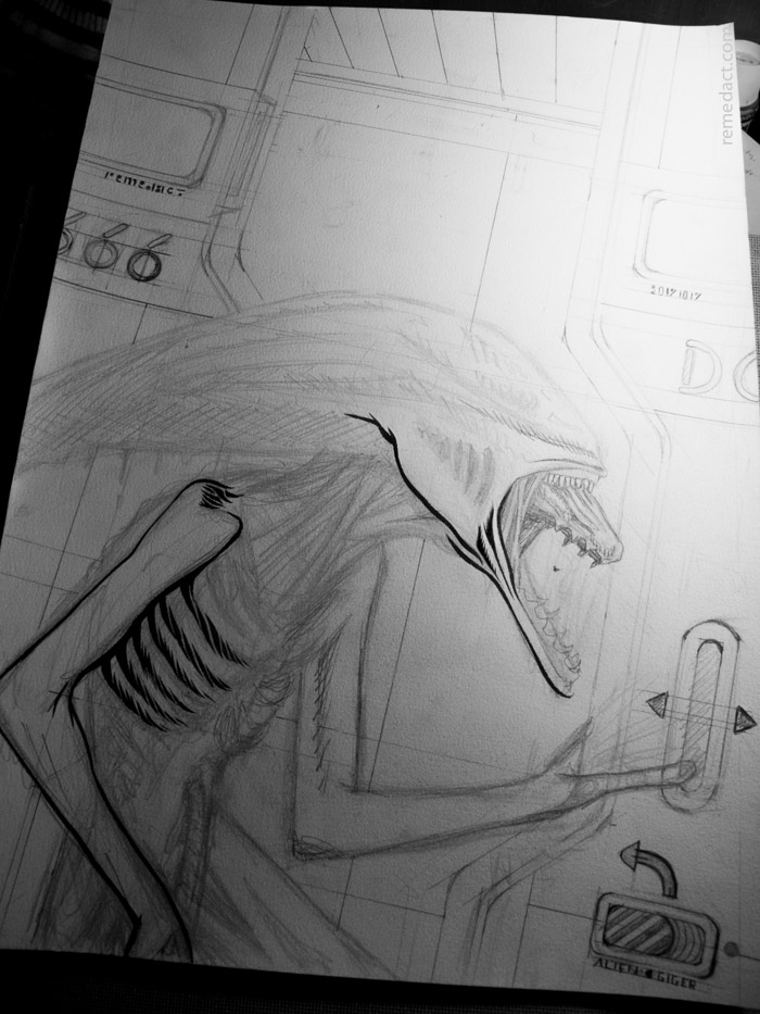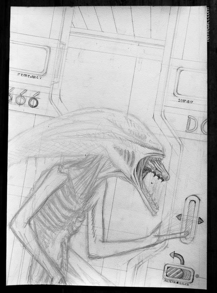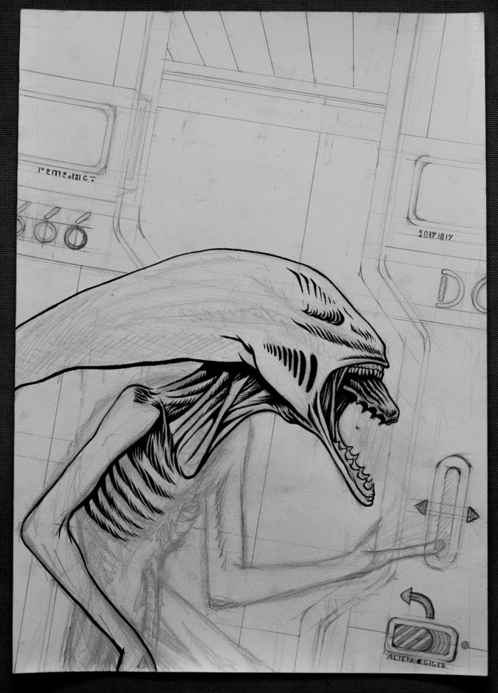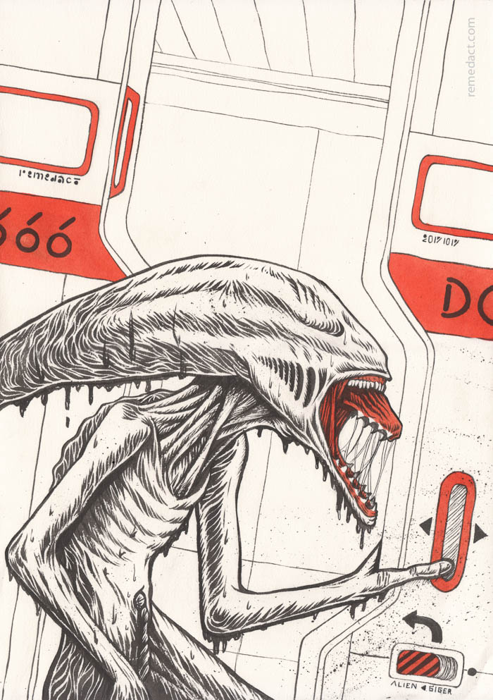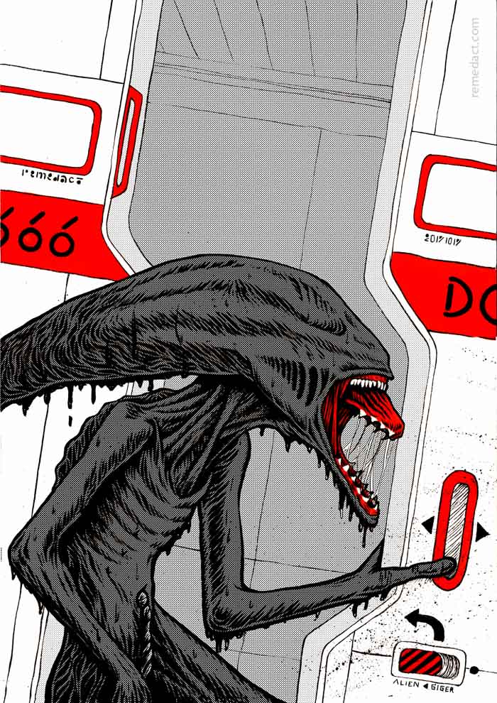 Ici j'ai représenté cet alien devant la porte 666 ("door"), à la manière de manga japonais : noir, blanc, rouge et trame de manga.