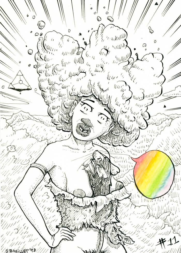 Carte de vœux manga : portrait de femme accompagnée d'un animal de compagnie, ± sauvage, ± chamanique.