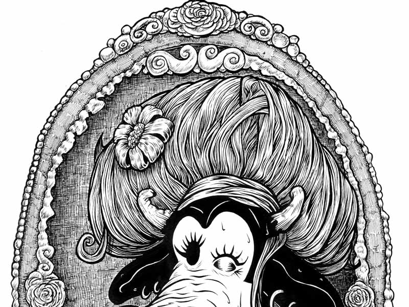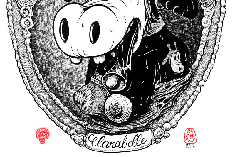 Portrait encadré, cochon et vintage de la vache Clarabelle (cow) de l'univers Disney. Elle a un sein hors de sa robe, porte une fleur dans les cheveux et une cloche. Elle tire une langue baveuse. Clarabelle (Clarabelle Cow en anglais) est un personnage de fiction de l'univers de Mickey Mouse créé par Ub Iwerks à partir de 1928 pour les studios Disney. Elle fut baptisée Bellecorne (1930) puis Yvette (1931) avant d'adopter son nom définitif en 1935.