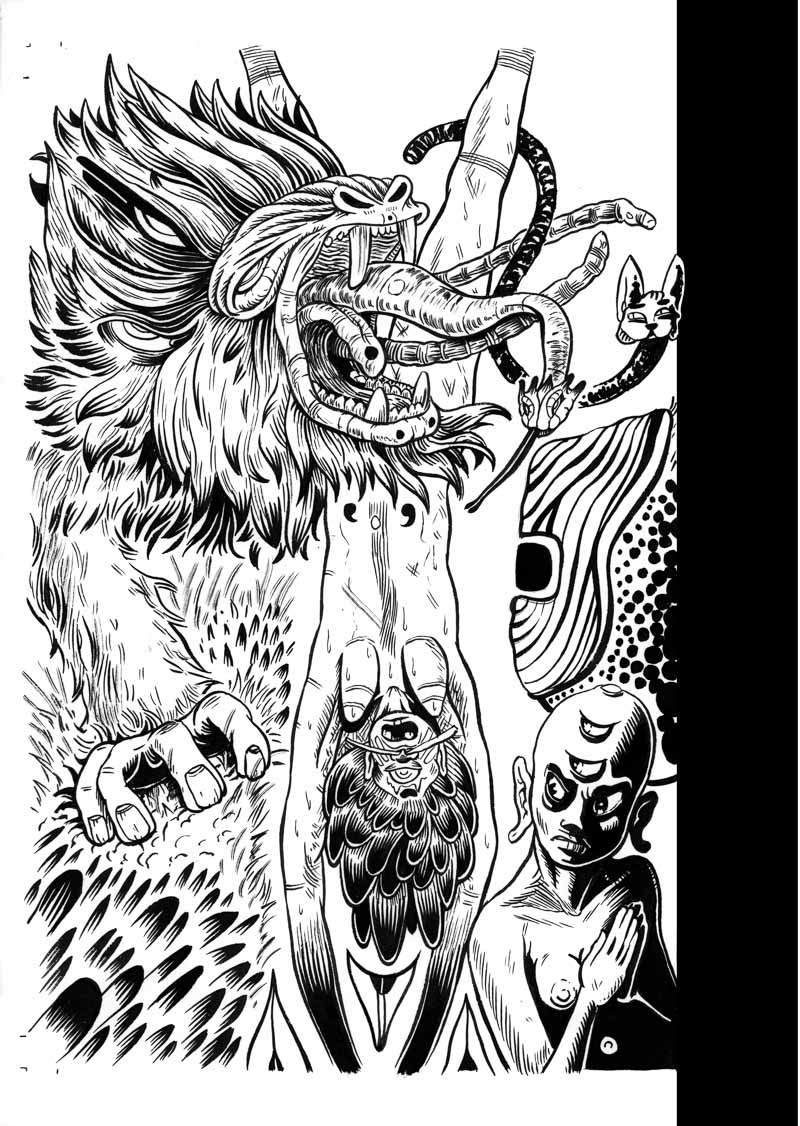 Une des 2 seules planche originale à présenter un chapitre, le #9. Melle K est ligotée la tête en bas, face à une nymphe diabolique coifée de la truffe d'un chat énorme, entendant le rugissement 'une chimère mandrill-éléphant-serpent