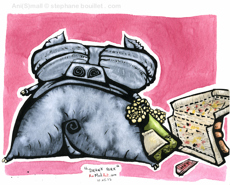 Un cochon saoul et obèse dort, une bière qui mousse à la patte, après avoir mangé une pizza, sans doute devant la télévision.