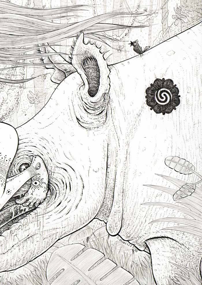 Elle lèche la première corne du rhinocéros, et tient en équilibre grâce à ses pieds nus posés sur la langue et dans la bouche baveuse du rhinocéros, tatoué lui aussi d'une fleur d'aubergine traditionnelle des tribus Dayak.
