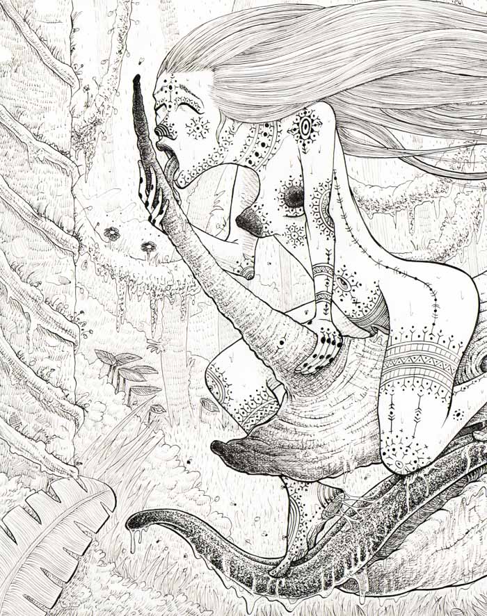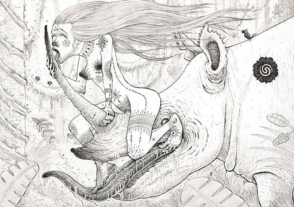 Image issue de l'univers de la BD "Bornéo" : une femme tatouée nue fait un rêve érotico-zoophile avec un rhinocéros de Bornéo, faisant partie de la clique des dieux-animaux.