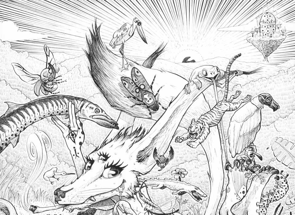 Les animaux sont : la déesse renard, marabout, sphinx à tête de mort, scarabée rhinocéros, grenouille kambo, barracuda, crocodile, hippopotame, scolopendre, libellule, étoile de mer, limace, singe nasique, vautour royal, chenille, cerf, koala, poulpe, tortue des Galapagos, manchot, rhinocéros, maki catta, blatte, loup, gecko, crabe, lièvre, castor, vipère, corbeau, megaptère, axolotl, requin baleine, murène, carangue, cobra royal, ours malais, rat, flamand rose, kiwi, chauve souris, tigre, tamanoir.