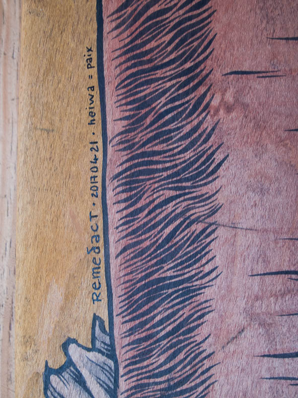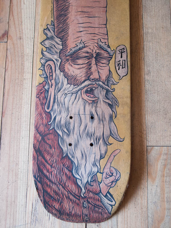 C'est un petit vieux chauve avec une très longue tête (phallique diront certain.es), une barbe blanche et des lobes d'oreilles agrandies. Je lui ai ajouté un troisième oeil, symbole de divinité, d'ouverture spirituelle et de la connaissance universelle. Il dit au chat "heiwa", ce qui veut dire "paix" en japonais, car le chat est sur le point de se confronter à une abeille/guêpe juste par peur.