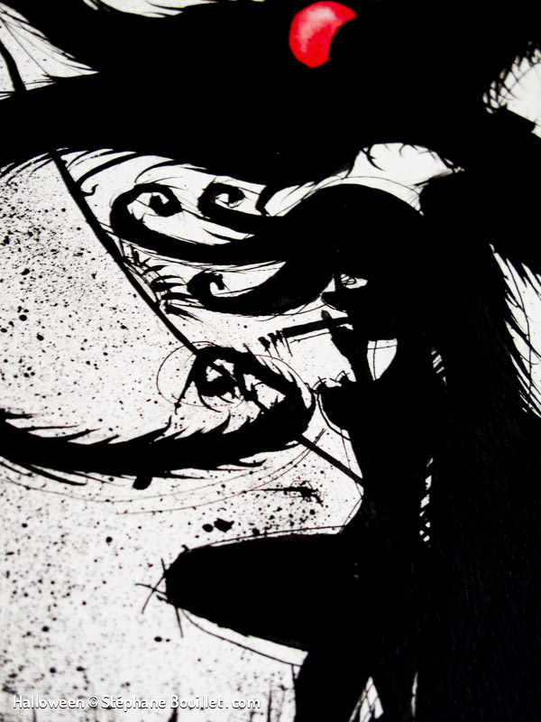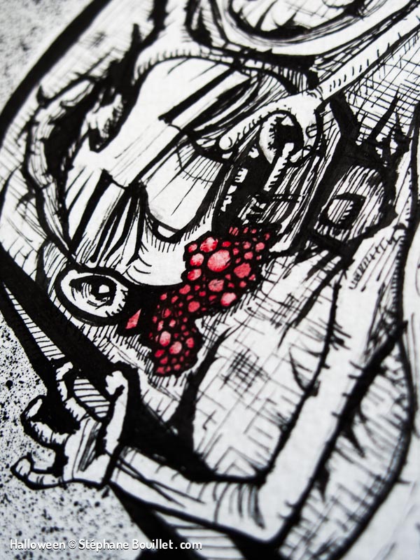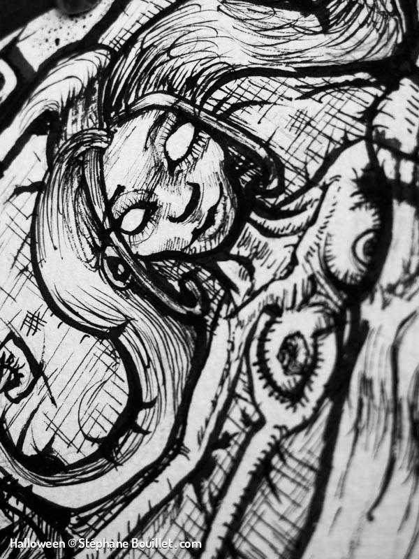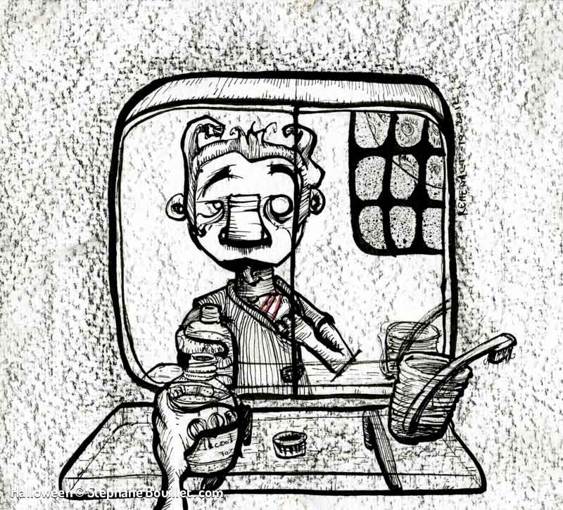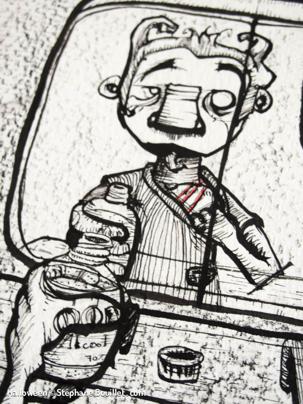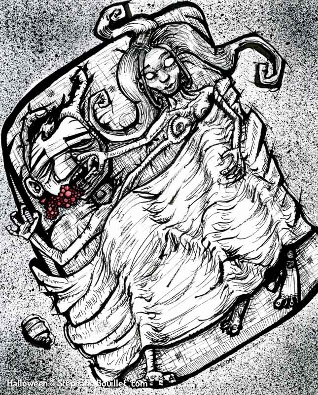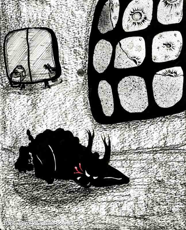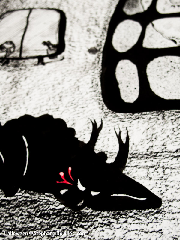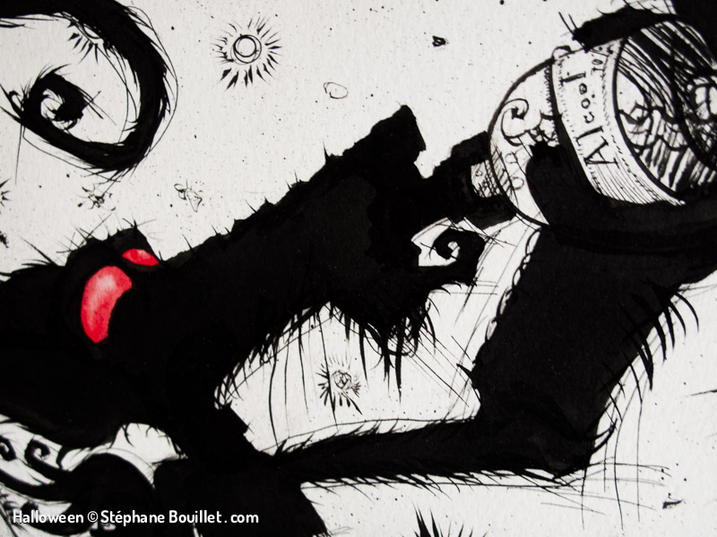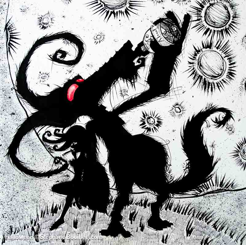 Quadriptique montrant le déroulement d’une nuit de pleine lune pour un loup-garou: • griffure et désinfection avec de l’alcool dans une salle de bain, • transformation, • nuit de fou: sex et alcool, • réveil dans un lit avec une gueule de bois, au coté d’une femme nue, qui tape sa cigarette dans notre bouche.