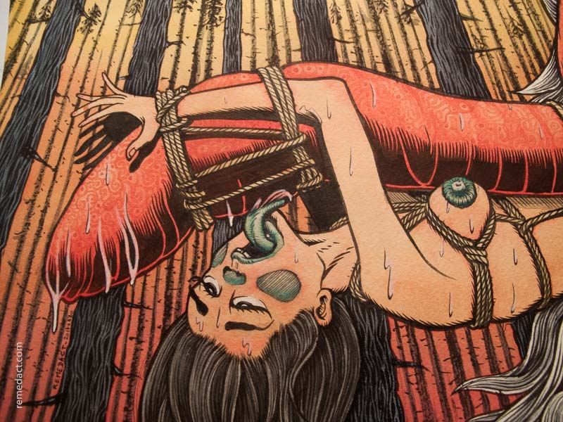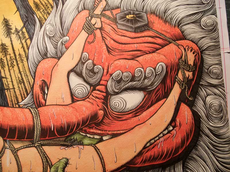 Une geisha nue est ligotée en bondage kinbaku (parfois appelé shibari) à un hanadaka tengu dans une forêt japonaise.