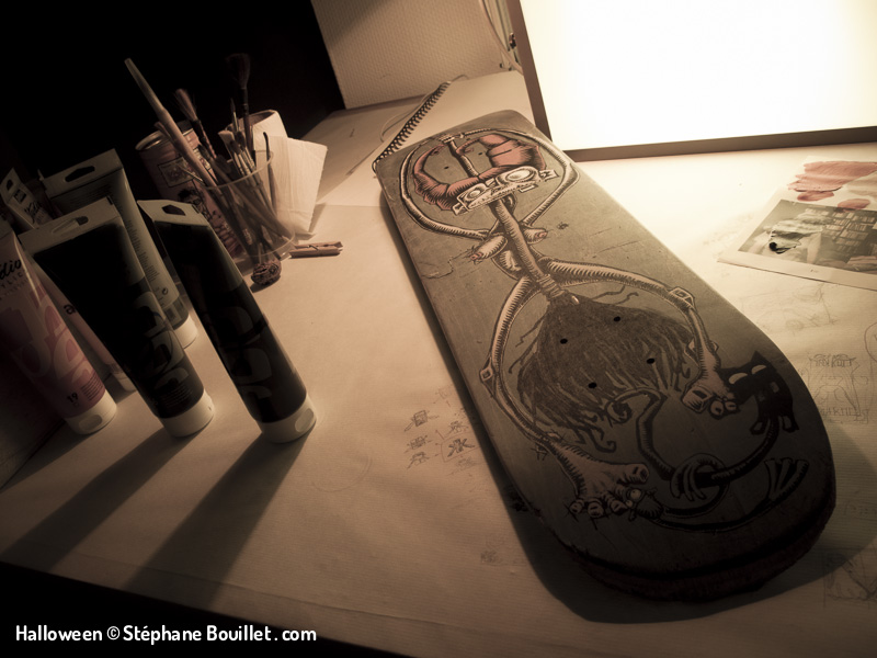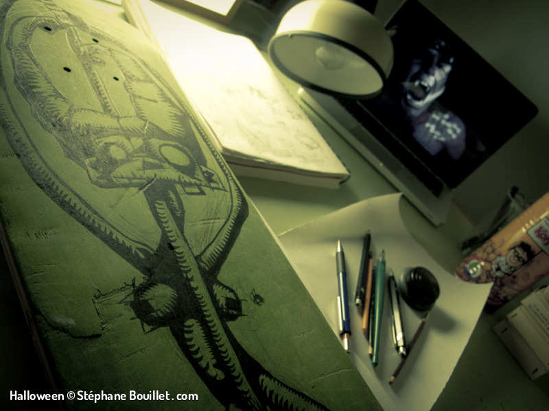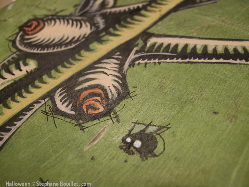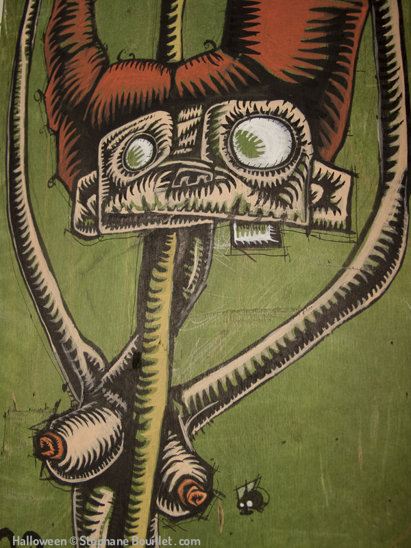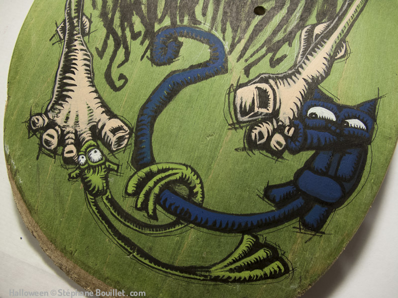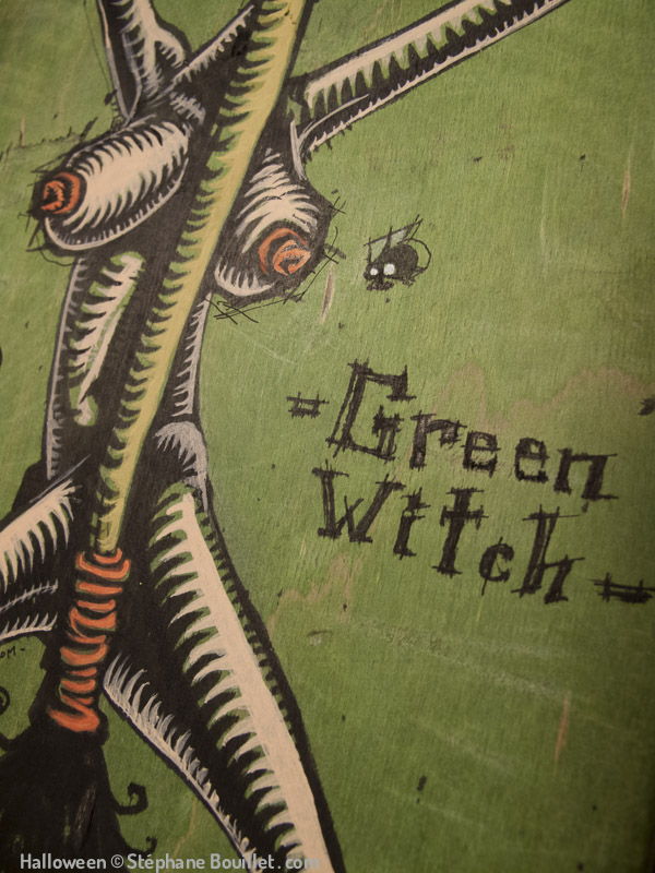 Green witch: sorcière nue entourant son balai. Ses cheveux comme des cornes sont roux comme les tétons de ses seins nus, approchés par une mouche. Ses pieds nus voient ses orteils sucés par une grenouillet et un petit chat bleuté fétichistes.