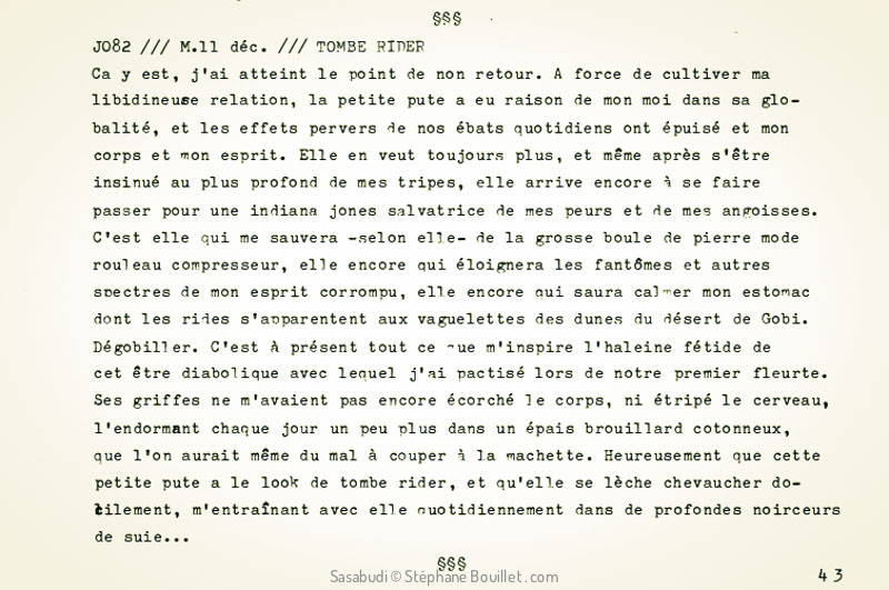 Ca y est, j'ai atteint le point de non retour. A force de cultiver ma libidineuse relation, la petite pute a eu raison de mon moi dans sa globalité, et les effets pervers de nos ébats quotidiens ont épuisé et mon corps et mon esprit. Elle en veut toujours plus, et même après s'être insinué au plus profond de mes tripes, elle arrive encore à se faire passer pour une indiana jones salvatrice de mes peurs et de mes angoisses. C'est elle qui me sauvera -selon elle- de la grosse boule de pierre mode rouleau compresseur, elle encore qui éloignera les fantômes et autres spectres de mon esprit corrompu, elle encore qui saura calmer mon estomac dont les rides s'apparentent aux vaguelettes des dunes du désert de Gobi. Dégobiller. C'est à présent tout ce que m'inspire l'haleine fétide de cet être diabolique avec lequel j'ai pactisé lors de notre premier fleurte. Ses griffes ne m'avaient pas encore écorché le corps, ni étripé le cerveau, l'endormant chaque jour un peu plus dans un épais brouillard cotonneux, que l'on aurait même du mal à couper à la machette. Heureusement que cette petite pute a le look de tombe rider, et qu'elle se lèche chevaucher docilement, m'entraînant avec elle quotidiennement dans de profondes noirceurs de suie…