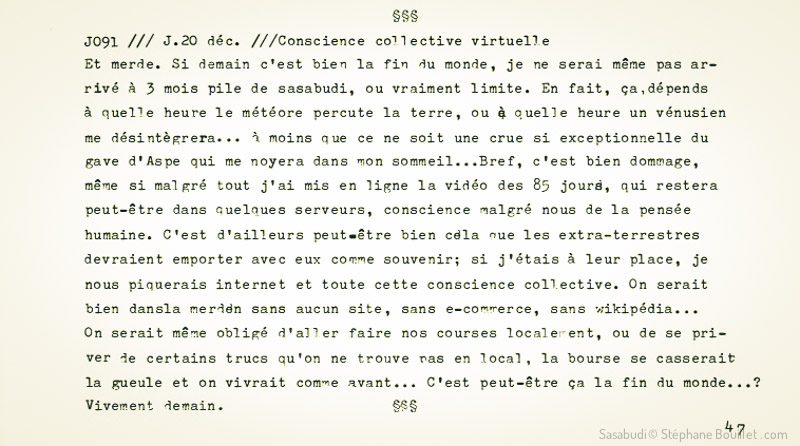 Et merde. Si demain c'est bien la fin du monde, je ne serai même pas arrivé à 3 mois pile de sasabudi, ou vraiment limite. En fait, ça dépends à quelle heure le météore percute la terre, ou à quelle heure un vénusien me désintègrera… à moins que ce ne soit une crue si exceptionnelle du gave d'Aspe qui me noiera dans mon sommeil… Bref, c'est bien dommage, même si malgré tout j'ai mis en ligne la vidéo des 85 jours, qui restera peut-être dans quelques serveurs, conscience malgré nous de la pensée humaine. C'est d'ailleurs peut-être bien cela que les extra-terrestres devraient emporter avec eux comme souvenir; si j'étais à leur place, je nous piquerais internet et toute cette conscience collective. On serait bien dans la merde sans aucun site, sans e-commerce, sans wikipédia… On serait même obligé d'aller faire nos courses localement, ou de se priver de certains trucs qu'on ne trouve pas en local, la bourse se casserait la gueule et on vivrait comme avant… C'est peut-être ça la fin du monde… ? Vivement demain.