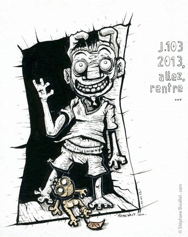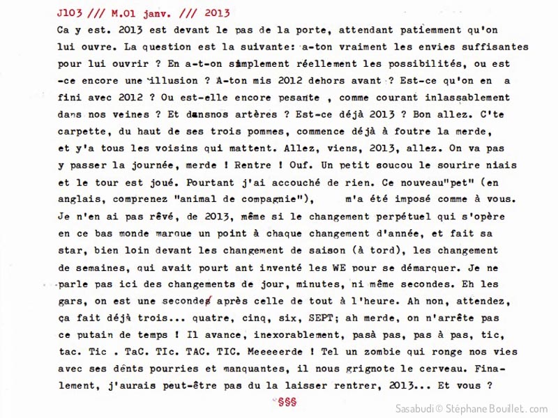 Ca y est. 2013 est devant le pas de la porte, attendant patiemment qu'on lui ouvre. La question est la suivante: a-ton vraiment les envies suffisantes pour lui ouvrir ? En a-t-on simplement réellement les possibilités, ou est -ce encore une illusion ? A-ton mis 2012 dehors avant ? Est-ce qu'on en a fini avec 2012 ? Ou est-elle encore pesante, comme courant inlassablement dans nos veines ? Et dans nos artères ? Est ce déjà 2013 ? Bon allez. C'te carpette, du haut de ses trois pommes, commence déjà à foutre la merde, et y'a tous les voisins qui mattent. Allez, viens, 2013, allez. On va pas y passer la journée, merde ! Rentre ! Ouf. Un petit coucou le sourire niais et le tour est joué. Pourtant j'ai accouché de rien. Ce nouveau "pet" (en anglais, comprenez "animal de compagnie"), m'a été imposé comme à vous. Je n'en ai pas rêvé, de 2013, même si le changement perpétuel qui s'opère en ce bas monde marque un point à chaque changement d'année, et fait sa star, bien loin devant les changements de saison (à tord), les changements de semaines, qui avaient pourtant inventé les WE pour se démarquer. Je ne parle pas ici des changements de jour, minutes, ni même secondes. Eh les gars, on est une seconde après celle de tout à l'heure. Ah non, attendez, ça fait déjà trois… quatre, cinq, six, SEPT; ah merde, on n'arrête pas ce putain de temps ! Il avance, inexorablement, pas à pas, pas à pas, tic, tac. Tic. TaC. Tic. TAC. TIC. Meeeeerde ! Tel un zombie qui ronge nos vies avec ses dênts pourries et manquantes, il nous grignote le cerveau. Finalement, j'aurais peut-être pas du la laisser rentrer, 2013… Et vous ?