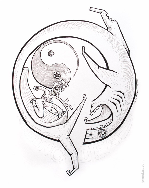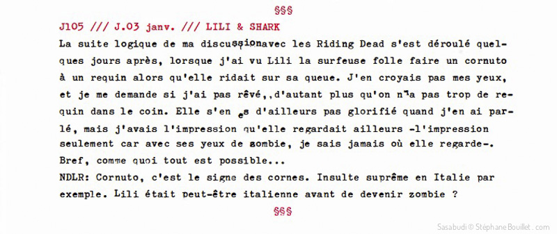 La suite logique de ma discussion avec les Riding Dead s'est déroulée quelques jours après, lorsque j'ai vu Lili la surfeuse folle faire un "cornuto" à un requin alors qu'elle ridait sur sa queue. J'en croyais pas mes yeux, et je me demande si j'ai pas rêvé, d'autant plus qu'on n'a pas trop de requins dans le coin. Elle s'en es d'ailleurs pas glorifiée quand j'en ai parlé, mais j'avais l'impression qu'elle regardait ailleurs -l'impression seulement car avec ses yeux de zombie, je sais jamais où elle regarde-. Bref, comme quoi tout est possible…