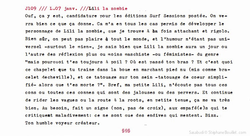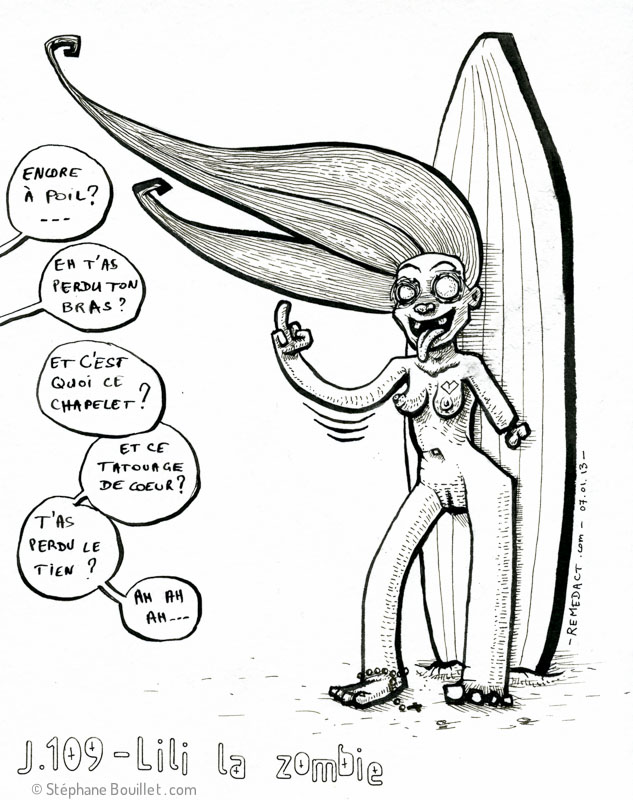 Ouf, ça y est, candidature pour les éditions Surf Sessions postée. On verra bien ce que ça donne. Ca m'a en tous les cas permis de développer le personnage de Lili la zombie, que je trouve à ma fois attachant et rigolo. Bien sûr, on peut pas plaire à tout le monde, et l'humour n'étant pas universel -surtout le mien- je sais bien que Lili la zombie aura un jour ou l'autre des réflexions plus ou moins maschistes -ou féministes- du genre "mais pourquoi t'es toujours à poil ? Où est passé ton bras ? Et c'est quoi ce chapelet que tu traîne dans la boue en marchant pieds nus (mis comme bracelet de cheville), et ce tatouage sur ton sein -tatouage de coeur simplifié- alors que t'es morte ?… Bref, ma petite Lili, n'écoute pas tous ces cons ou toutes ces connes qui sont des jalouses ou des pervers. Et continue de rider les vagues ou la route à la roots, en petite tenue, ça me va très bien. Au besoin, fait un signe (non, pas de croix), aux empafé(e)s qui te critiquent maladivement : ce ne sont que des endives qui mentent. Bizz. Ton humble voyeur créateur.