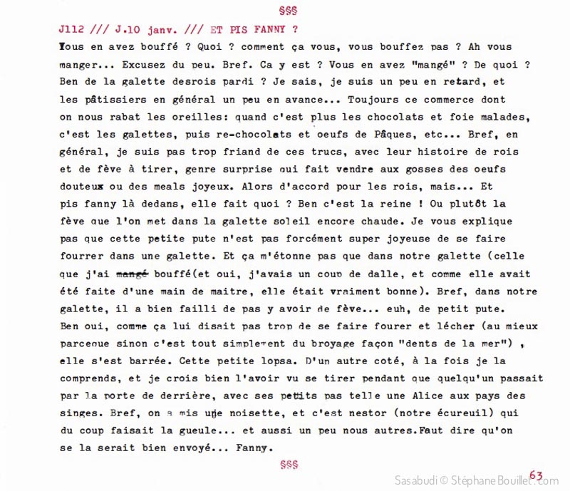 Yous en avez bouffé ? Quoi ? Comment ça vous, vous bouffez pas ? Ah vous mangez… Excusez du peu. Bref. Ca y est ? Vous en avez "mangé" ? De quoi? Ben de la galette des rois pardi ? Je sais, je suis un peu en retard, et les pâtissiers en général un peu en avance… Toujours ce commerce dont on nous rabat les oreilles: quand c'est plus les chocolats et foies malades, c'est les galettes, puis re-chocolats et oeufs de Pâques, etc… Bref, en général, je suis pas trop friand de ces trucs, avec leur histoire de rois et de fève à tirer, genre surprise qui fait vendre aux gosses des oeufs douteux ou des meals joyeux. Alors d'accord pour les rois, mais… Et pis fanny là dedans, elle fait quoi ? Ben c'est la reine ! Ou plutôt la fève que l'on met dans la galette soleil encore chaude. Je vous explique pas que cette petite pute n'est pas forcément super joyeuse de se faire fourrer dans une galette. Et ça m'étonne pas que dans notre galette (celle que j'ai mang… bouffé (et oui, j'avais un coup de dalle, et comme elle avait été faite d'une main de maître, elle était vraiment bonne) . Bref, dans notre galette, il a bien failli ne pas y avoir de fève… euh, de petit pute. Ben oui, comme ça lui disait pas trop de se faire fourrer et lécher (au mieux parce que sinon c'est tout simplement du broyage façon "dents de la mer") elle s'est barrée. Cette petite lopsa. D'un autre coté, à la fois je la comprends, et je crois bien l'avoir vue se tirer pendant que quelqu'un passait par la porte de derrière, avec ses petits pas telle une Alice aux pays des singes. Bref, on a mis une noisette, et c'est nestor (notre écureuil) qui du coup faisait la gueule… et aussi un peu nous autres. Faut dire qu'on se la serait bien envoyé… Fanny.