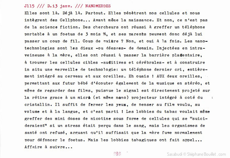 Elles sont là. Déjà là. Partout. Elles pénètrent nos cellules et nous intègrent des Cellphones… Avant même la naissance. Et non, ce n'est pas de la science-fiction. Des chercheurs ont réussi à greffer un téléphone portable à un foetus de 3 mois et 1/2, et ses parents peuvent donc déjà lui passer un coup de fil. Coup de maître ? Non, et oui à la fois. Les nanotechnologies sont les dieux -ou déesses- de demain. Injectées en intraveineuse à la mère, elles ont réussi à passer la barrière placentaire, à trouver les cellules cibles -auditives et cérébrales- et à construire in situ une merveille de technologie: un téléphone dernier cri, entièrement intégré au cerveau et aux oreilles. Eh ouais ! Aux DEUX oreilles, permettant aux futur bébé d'écouter également de la musique en stéréo, et même de regarder des films, puisque le signal est directement projeté sur la rétine grâce à un micro (et même nano) projecteur intégré à coté du cristallin. Il suffit de fermer les yeux, de penser au film voulu, au volume et à la langue, et c'est parti ! Les lobbies du tabac voulaient même greffer des mini-doses de nicotine sous forme de cellules qui se "suicideraient" (apoptose) si un stress était perçu dans le sang, mais les organismes de santé ont refusé, arguant qu'il suffisait que la mère fume normalement pour défoncer le foetus. Mais les lobbies tabagiques ont fait appel… Affaire à suivre…