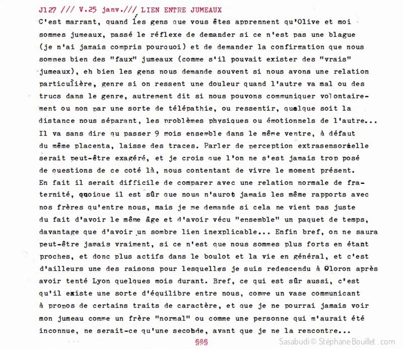 C’est marrant, quand les gens que vous êtes apprennent qu’Olive et moi sommes jumeaux, passé le réflexe de demander si ce n’est pas une blague (je n’ai jamais compris pourquoi) et de demander la confirmation que nous sommes bien des « faux » jumeaux (comme s’il pouvait exister des « vrais » jumeaux), eh bien les gens nous demandent souvent si nous avons une relation particulière, genre si on ressent une douleur quand l’autre va mal ou des trucs dans le genre, autrement dit si nous pouvons communiquer volontairement ou non par une sorte de télépathie, ou ressentir, quelque soit la distance nous séparant, les problèmes physiques ou émotionnels de l’autre… Il va sans dire qu passer 9 mois ensemble dans le même ventre, à défaut du même placenta, laisse des traces et tisse des liens. Parler de perception extrasensorielle serait peut-être exagéré, et je crois que l’on ne s’est jamais trop posé de questions de ce coté là, nous contentant de vivre le moment présent. En fait il serait difficile de comparer avec une relation normale de fraternité, quoique il est sûr que nous n’auront jamais les même rapports avec nos frères qu’entre nous, mais je me demande si cela ne vient pas juste du fait d’avoir le même âge et n’avoir vécu « ensemble » un paquet de temps, davantage que d’avoir un sombre lien inexplicable… Enfin bref, on ne le saura peut-être jamais vraiment, si ce n’est que nous sommes plus forts en étant proches, et donc plus actifs dans le boulot et la vie en général, et c’est d’ailleurs une des raisons pour lesquelles je suis redescendu à Oloron après avoir tenté Lyon quelques mois durant. Bref, ce qui est sûr aussi, c’est qu’il existe une sorte d’équilibre entre nous, comme un vase communicant à propos de certains traits de caractère, et que je ne pourrai jamais voir mon jumeau comme un frère « normal » ou comme une personne qui m’aurait été inconnue, ne serait-ce qu’une seconde, avant que je ne la rencontre…