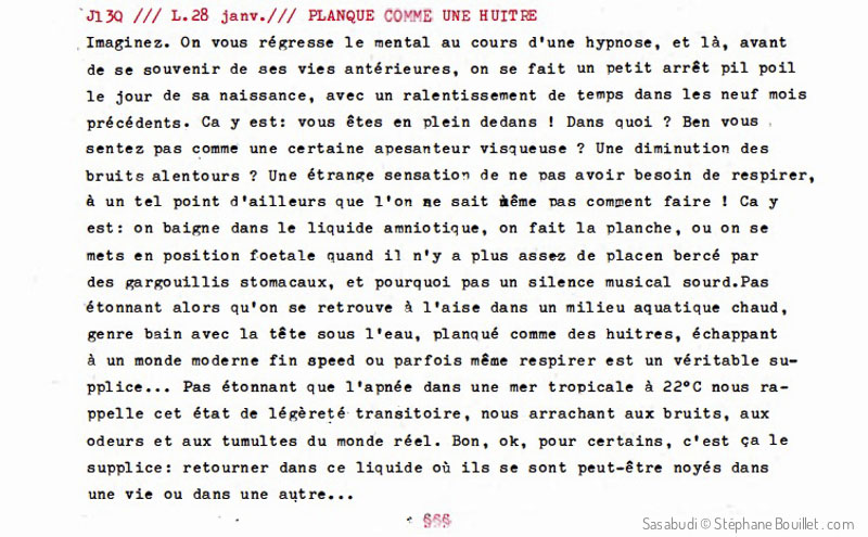 Imaginez. On vous régresse le mental au cours d'une hypnose, et là, avant de se souvenir de ses vies antérieures, on se fait un petit arrêt pil poil le jour de sa naissance, avec un ralentissement de temps dans les neuf mois précédents ! Ca y est: vous êtes en plein dedans ! Dans quoi ? Ben vous sentez pas comme une certaine apesanteur visqueuse ? Une diminution des bruits alentours ? Une étrange sensation de ne pas avoir besoin de respirer, à un tel point d'ailleurs que l'on ne sait même pas comment faire ! Ca y est: on baigne dans le liquide amniotique, on fait la planche, ou on se met en position fœtale quand il n'y a plus assez de place, bercé par des gargouillis stomacaux, et pourquoi pas, un silence musical sourd. Pas étonnant alors qu'on se retrouve à l'aise dans un milieu aquatique chaud, genre bain avec la tête sous l'eau, planqué comme des huîtres, échappant à un monde moderne fin speed, où parfois même respirer est un véritable supplice… Pas tonnant que l'apnée dans une mer tropicale à 22°C nous rappelle cet état de légèreté transitoire, nous arrachant aux bruits, aux odeurs et aux tumultes du monde réel. Bon, ok, pour certains, c'est ça le supplice: retourner dans ce liquide où ils se sont peut-être noyés dans une vie ou dans une autre • • •