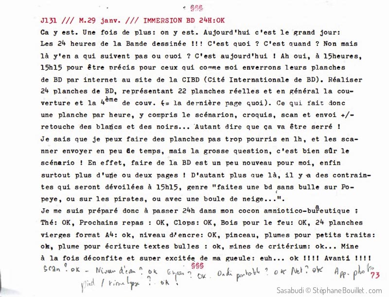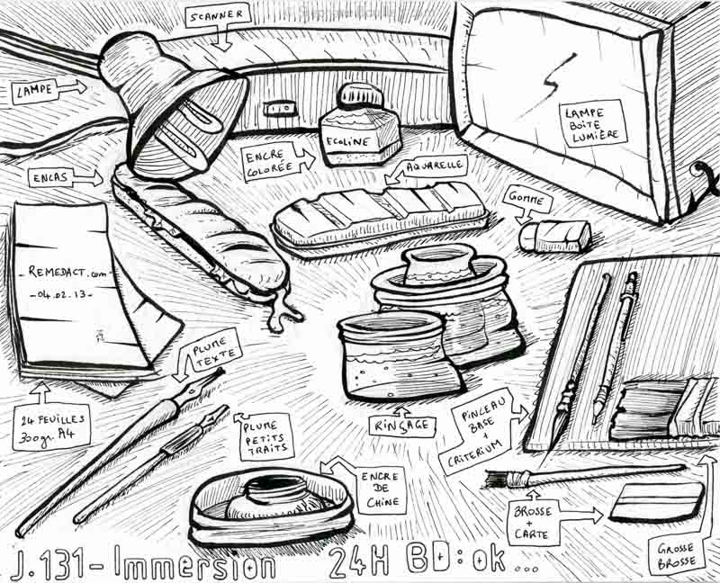 Ca y est. Une fois de plus: on y est. Aujourd'hui c'est le grand jour: les 24 heures de la Bande dessinée d'Angoulème !!! C'est quoi ? C'est quand ? Non mais là y'en a qui suivent pas ou quoi ? C'est aujourd'hui ! Ah oui, à 15heures, 15h15 pour être précis pour ceux qui comme moi enverrons leurs planches de BD par internet au site de la CIBD (Cité Internationale de BD). Réaliser 24 planches de BD, représentant 22 planches réelles et en général la couverture et la 4ème de couv. (= la dernière page quoi). Ce qui fait donc une planche par heure, y compris le scénario, croquis, scan et envoi +/retouche des blancs et des noirs… Autant dire que ça va être serré ! Je sais que je peux faire des planches pas trop pourries en 1h, et les scanner envoyer en peu de temps, mais la grosse question, c'est bien sûr le scénario ! En effet, faire de la BD est un peu nouveau pour moi, enfin surtout plus d'une ou deux pages ! D'autant plus que là, il y a des contraintes qui seront dévoilées à 15h15, genre "faites une bd sans bulle sur Popeye, ou sur les pirates, u avec une boule de neige… ". Je me suis préparé donc à passer 24h dans mon cocon amniotico-bureautique: Thé: OK, Prochains repas : OK, Clops: OK, Bois pour le feu: OK, 24 planches vierges format A4: ok, niveau d'encre: OK, pinceau, plumes pour petits traits: ok. Plume pour écriture textes bulles : ok, mines de critérium: ok, Scanner ? OK. Niveau d'eau Ok. Encas ? Ok. Ordinateur portable ? Ok. Appareil photo et pied pour Time-Lapse ? Ok… Mine à la fois déconfite et super excitée de ma gueule: euh… ok !!!! Avanti !!!!