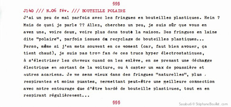 J'ai un peu de mal parfois avec les fringues en bouteilles plastiques. Hein ? Mais de quoi je parle ?? Allez, cherchez un peu, je suis sûr que vous en avez une, voire deux, voire plus dans toute la maison. Des fringues en laine dite "polaire", parfois issues da recyclage de bouteilles plastiques… Perso, même si j'en mets souvent en ce moment (car, faut bien avouer, ça tient chaud), je suis pas trop fan de ces trucs hyper électrostatiques, à s'électriser les cheveux quand on les enlève, en se prenant une déchagge électrique en sortant de la voiture, ou à capter un max de poussières et autres acariens. Je me sens mieux dans des fringues "naturelles", plus respirantes et moins puantes, permettant peut-être une meilleure connection avec notre entourage que d'être bardé de bouteilles plastiques, tout en en respirant régulièrement…