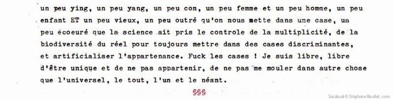 Je suis une case. Ou plus exactement « dans » une case. Enfin, c’est ce que l’on essaie de faire. De me mettre dedans. Et tout le monde essaie et s’évertue à faire de même. De quoi je parle ? Mais de tout bien sûr ! De tout et de son contraire plus précisément. Le mode bipolaire ne nous quitte pas dès notre naissance: c’est une fille OU un garçon ? Euh ben, c’est-à-dire, l’enfant choisira à 18 ans… Et Dark Vador ? Bon OU méchant ? Ben euh, en fait il est pas si bon qu’il est méchant, et il préfèrerait le rose, mais pour des questions de budget, et de respect des cases, ben… Idem pour les ordi: 0 OU 1 ? Binaire. Hétéro OU homo ? Graphiste OU photographe ? Auteur OU artisan ? Tu m’aimes OU tu m’aimes pas ? Ben euh, c’est-à-dire que sur une échelle de 1 à 1O et en tenant compte que tu me casses les c… Bref, même si nous avions cru en naissant que tout était possible, les mouches savantes ont cru savoir bien faire en nous apprenant par exemple que non, on ne peut pas décemment être un canard ET un Mammifère, être de droite ET de gauche, être bon ET parfois méchament con, aimer le sport ET la clope, être peintre ET sculpteur, être clitoridienne ET vaginale… etc. Non parce que là je m’égare. Bref. Nochoice, ou just 2 choices. C’est ce que nous offre notre société de merde. Alors FUCK U ! Fuck the binaire ! A bas le rangement dans des cases, origine même de l’intolérance, du racisme, alors que nous sommes tous un peu africains, un peu politiques, un peu drogués, un peu ying, un peu yang, un peu cons, un peu femme ET un peu homme, un peu enfant ET un peu vieux, un peu outré qu’on nous mette dans une case, un peu écoeuré que la science ait pris le contrôle de la multiplicité, de la biodiversité du réel pour toujours mettre dans des cases discriminantes, et artificialiser l’appartenance. Fuck les cases ! Je suis libre, libre d’être unique et de ne pas appartenir, de ne pas me mouler dans autre chose que l’universel, le tout, l’un et le néant.