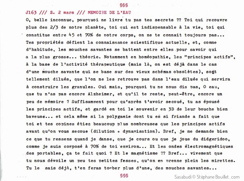 Ô, belle inconnue, pourquoi ne livres-tu pas tes secrets ?? Toi qui recouvre plus des 2/3 de notre planète, toi qui est indispensable à la vie, toi qui constitue entre 45 et 70% de notre corps, on ne te connait toujours pas… Tes propriétés défient la connaissance scientifique actuelle, et, comme d'habitude, les mouches savantes se battent entre elles pour savoir qui a la plus grosse… théorie. Notamment en homéopathie, les "principes'actifs", à la base de l'activité thérapeutique (mais là, on est déjà dans le cas d'une mouche savante qui se base sur de vieux schémas obsolètes), sont tellement dilués, que l'on ne les retrouve pas dans l'eau diluée qui servira à construire les granules. Oui mais, pourquoi tu ne nous dis pas, Ô eau, que tu n'as pas encore Alzheimer, et qu'il te reste, peut-être, encore un peu de mémoire ? Suffisamment pour qu'après t'avoir secoué, tu as épousé les principes actifs, et gardé en toi le souvenir en 3D de leur bouche bien baveuse… et cela même si la polygamie dont tu es si friande a fait que toi et tes copines étiez beaucoup plus nombreuses que les principes actifs avant qu'on ne vous secoue (dilution + dynamisation). Bref, je me demande bien ce que tu ressens quand je danse, que je cours ou que je joue du digeridoo, comme je suis composé à 70% de toi environ… Et les ondes électromagnétiques des portables, ça te fait quoi ? Et le magnétisme ?? Bref… vivement que tu nous dévoiles un peu tes petites fesses, qu'on en prenne plein les mirettes. Tu le sais déjà, t'en feras tomber plus d'une, des mouches savantes…