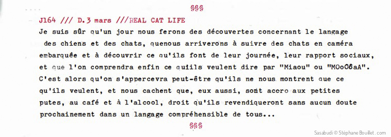 Je suis sûr qu'un jour nous ferons des découvertes concernant le langage des chiens et des chats, que nous arriverons à suivre des chats en caméra embarquée et à découvrir ce qu'ils font de leur journée, leurs rapports sociaux, et que l'on comprendra enfin ce qu'ils veulent dire par "Miaou" ou "MOoOôaA". C'est alors qu'on s'apercevra peut-être qu'ils ne nous montrent que ce qu'ils veulent, et nous cachent que, eux aussi, sont accros aux petites putes, au café et à l'alcool, droit qu'ils revendiqueront sans aucun doute prochainement dans un langage compréhensible de tous…