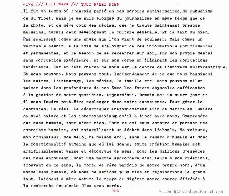 Il fut un temps où j'aurais parlé en ces sombres anniversaires, de Fukushima ou du Tibet, mais je me suis éloigné du journalisme en même temps que de la photo, et du même coup des médias, que je trouve maintenant presque malsains, hormis ceux développant la culture générale. Et ça fait du bien. Pas seulement comme une envie que l'on vient de soulager. Mais comme un véritable besoin. À la fois de s'éloigner de ces informations abrutissantes et permanentes, et le besoin de se recentrer sur soi, sur son propre mental sans corruption extérieure, et sur son corps en éliminant les corruptions intérieurs. Car en fait chacun de nous est le centre de l'univers multicentrique. Et nous pouvons. Nous pouvons tout. Indépendamment de ce que nous bassinent les autres, l'entourage, les médias, la famille etc. Nous pouvons aller puiser dans les profondeurs de nos âmes les forces abyssales suffisantes à la gestion de notre quotidien. Aujourd'hui. Car demain est un autre jour et il nous faudra peut-être replonger dans notre conscience. Pour gérer le quotidien. Le réel. Le décortiquer anatomiquement afin de mettre en lumière sa vraie nature et les interconnexions qu'il a tissé avec nous. Comprendre que sans humain, tout n'est rien. Tout ce qui nous entoure et portant une empreinte humaine, est naturellement un déchet dans l'absolu. Ma voiture, mon ordinateur, mon vélo, ma maison etc., sans le regard d'humain et donc la fonctionnalité humaine que JE lui donne, toute création humaine est artificiellement vaine et dépourvue de sens, pour les millions d'espèces qui nous entourent, dont une partie succombera d'ailleurs à nos créations, trouvant en ce sens, la mort. Je rêve parfois de notre propre mort, d'un monde sans humain, où nous ne serions plus rien et rejoindrions le grand tout, laissant à mère Nature le temps de digérer notre course éffrénée à la recherche décadente d'un sens perdu.