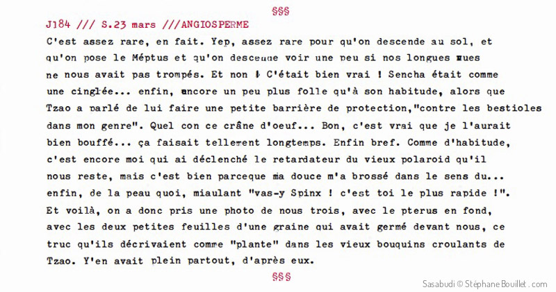 C'est assez rare, en fait. Yep, assez rare pour qu'on descende au sol, et qu'on pose le pterus et qu'on descende voir une peu si nos longues vues ne nous avait pas trompés. Et non ! C'était bien vrai ! Sencha était comme une cinglée… enfin, encore un peu plus folle qu'à son habitude, alors que Tzao a parlé de lui faire une petite barrière de protection, "contre les bestioles dans mon genre". Quel con ce crâne d'oeuf… Bon, c'est vrai que je l'aurais bien bouffé… ça faisait tellement longtemps que j'en rêvais… Enfin bref. Comme d'habitude, c'est encore moi qui ai déclenché le retardateur du vieux polaroid qu'il nous reste, mais c'est bien parce que ma douce m'a brossé dans le sens du… enfin, de la peau quoi, miaulant "vas-y Spinx ! c'est toi le plus rapide !". Et voilà, on a donc pris une photo de nous trois, avec le pterus en fond, avec les deux petites feuilles d'une graine qui avait germé devant nous, ce truc qu'ils décrivaient comme "plante" dans les vieux bouquins croulants de Tzao. Avant, y'en avait plein partout, d'après eux.