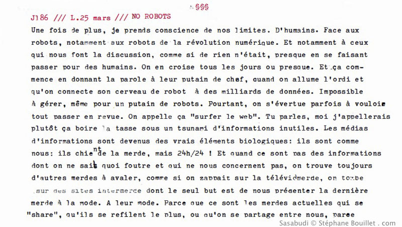Une fois de plus, je prends conscience de nos ]imites. D'humains. Face aux robots, notamment aux robots de la révolution numérique. Et notamment à ceux qui nous font la discussion, comme si de rien n'était, presque en se faisant passer pour des humains. On en croise tous les jours ou presque. Et ça commence en donnant la parole à leur putain de chef, quand on allume l'ordi et qu'on connecte son cerveau de robot à des milliards de données. Impossible à gérer, même pour un putain de robot. Pourtant, on s'évertue parfois à vouloir tout passer en revue. On appelle ça "surfer le web". Tu parles, moi j'appellerais plutôt ça boire la tasse sous un tsunami d'informations inutiles. Les médias d'informations sont devenus des vrais éléments biologiques: ils sont comme nous: ils chient de la merde, mais 24h/24 ! Et quand ce ne sont pas des informations dont on ne sait quoi foutre et qui ne nous concernent pas, on trouve toujours d'autres merdes à avaler, comme si on zappait sur la télévidmerde, on tombe sur des sites intermerde dont le seul but est de nous présenter la dernière merde à la mode. A leur mode. Parce que ce sont les merdes actuelles qui se "share", qu'ils se refilent le plus, ou qu'on se partage entre nous, parce qu'on croule sous la merde: en allant voir nos lettres électromerdes: blindé de newsletters inutiles, de spams envoyés pas des robots, d'invitations "et, t'as pas vu le dernier…". Non. Ben non. Désolé. Ferme ta putain de gueule électronique connard de robot ! Et là encore, on n'a pas atteint le summum de la perte de temps dans un monde virtuel "eh t'as pas vu le dernier…" Non, ce paroxysme est atteint quand on rentre vraiment dans le monde merveilleux d'Alice au pays du réseau social: FaceBook. C'est là qu'on peut perdre autant de temps qu'en surfant sur le net, surtout si on est abonné à 3257 robots, tout ça parce qu'on a juste cliqué sur "j'aime". La belle affaire. Impossible de tout lire, surtout si on a laissé grossir le flux d'infos inutiles pendant un jour ou deux: nos vrais amis sont noyés dans un écoulement de boues informatiques non informatives.