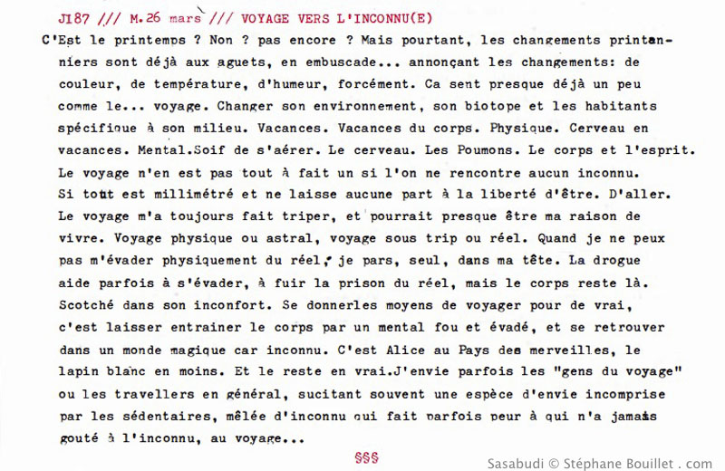 C'est le printemps ? Non ? Pas encore ? Mais pourtant, les changements printanniers sont déjà aux aguets, en embuscade… annonçant les changements: de couleur, de température, d'humeur, forcément. Ça sent presque déjà un peu comme le… voyage. Changer son environnement, son biotope et les habitants spécifique à son milieu. Vacances. Vacances du corps. Physique. Cerveau en vacances. Mental. Soif de s'aérer. Le cerveau. Les poumons. Le corps et l'esprit. Le voyage n'en est pas tout à fait un si l'on ne rencontre aucun inconnu. Si tout est millimétré et ne laisse aucune part à la liberté d'être. D'aller. Le voyage m'a toujours fait triper, et pourrait presque être ma raison de vivre. Voyage physique ou astral, voyage sous trip ou réel. Quand je ne peux pas m'évader physiquement du réel, je pars, seul, dans ma tête. La drogue aide parfois à s'évader, à fuir la prison du réel, mais le corps reste là. Scotché dans son inconfort. Se donner les moyens de voyager pour de vrai, c'est laisser entrainer le corps par un mental fou et évadé, et se retrouver dans un monde magique car inconnu. C'est Alice au Pays des merveilles, le lapin blanc en moins. Et le reste en vrai. J'envie parfois les "gens du voyage" ou les travellers en général, suscitant souvent une espèce d'envie incomprise par les sédentaires, mêlée d'inconnu qui fait parfois peur à qui n'a jamais gouté à l'inconnu, au voyage…