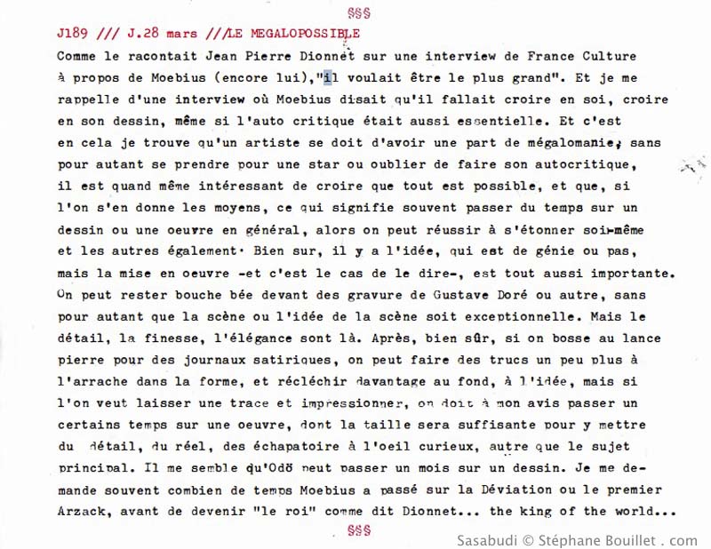 Comme le racontait Jean Pierre Dionnet sur une interview de France Culture à propos de Moebius (encore lui), "Il voulait être le plus grand". Et je me rappelle d'une interview où Moebius disait qu'il fallait croire en soi, croire en son dessin, même si l'autocritique était aussi essentielle. Et c'est en cela je trouve qu'un artiste se doit d'avoir une part de mégalomanie, sans pour autant se prendre pour une star ou oublier de faire son autocritique, il est quand même intéressant de croire que tout est possible, et que, si l'on s'en donne les moyens, ce qui signifie souvent passer du temps sur un dessin ou une oeuvre en général, alors on peut réussir à s'étonner soi-même et les autres également. Bien sûr, il y a l'idée, qui est de génie ou pas, mais la mise en oeuvre -et c'est le cas de le dire-, est tout aussi importante. On peut rester bouche bée devant des gravures de Gustave Doré ou autre, sans pour autant que la scène ou l'idée de la scène soit exceptionnelle. Mais le détail, la finesse, l'élégance sont là. Après, bien sûr, si on bosse au lance pierre pour des journaux satiriques, on peut faire des trucs un peu plus à l'arrache dans la forme, et récléchir davantage au fond, à l'idée, mais si l'on veut laisser une trace et impressionner, on doit à mon avis passer un certains temps sur une oeuvre, dont la taille sera suffisante pour y mettre du détail, du réel, des échapatoires à l'oeil curieux, au autre que le sujet principal. Il me semble qu'Odö peut passer un mois sur un dessin. Je me demande souvent combien de temps Moebius a passé sur la Déviation ou le premier Arzach, avant de devenir "le roi" comme dit Dionnet… the king of the world…