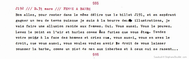 Bon allez, pour rester dans le même délire que le billet J191, et en espérant gagner un peu de temps puisque je suis à la bourre des illustrations, je vais faire une allusion rapide aux femmes. Oui. Vous aussi. Vous le pouvez. Levez le poing en l'air et hurlez comme les furies que vous êtes. Tendez votre poing à la face des hommes et criez que, vous aussi, vous en avez le droit, que vous aussi, vous voulez avoir le droit de vous laisser pousser la barbe, comme un pied de nez aux imberbes et à ceux qui se rasent…