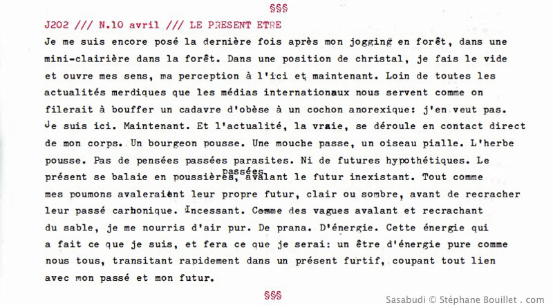 Je me suis encore posé la dernière fois après mon jogging en forêt, dans une mini-clairière entourée d'arbres. Au sol, dans une position christale, je fais le vide et ouvre mes sens, ma perception à l'ici et maintenant. Loin de toutes les actualités merdiques que les médias internationaux nous servent comme on filerait à bouffer un cadavre d'obèse à un cochon anorexique: j'en veut pas. Je suis ici. Maintenant. Et l'actualité, la vraie, se déroule en contact direct de mon corps. Un bourgeon grossit. Une mouche passe. Un oiseau piaille. L'herbe pousse. Pas de pensées passées parasites. Ni de futures hypothétiques. Le présent se balaie en poussières passées avalant le futur inexistant. Tout comme mes poumons avaleraient leur propre futur, clair ou sombre, avant de recracher leur passé carbonique. Incessant. Comme des vagues avalant et recrachant du sable, je me nourris d'air pur. De prana. D'énergie. Cette énergie qui a fait ce que je suis, et fera ce que je serai: un être d'énergie pure comme nous tous, transitant rapidement dans un présent furtif, coupant tout lien avec mon passé et mon futur.