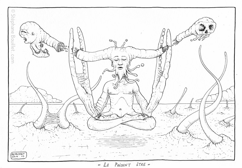 Légende : Un humanoïde en lévitation dans un désert d'où sortent des langues, coupe tout lien avec son passé et son futur, grâce à des pinces matérialisées par son mental
