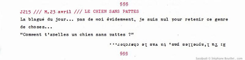 La blague du jour… pas de moi évidemment, je suis nul pour retenir ce genre de choses…Q: "Comment t'appelles un chien sans pattes ?"R: Tu l'appelles pas, tu vas le chercher…