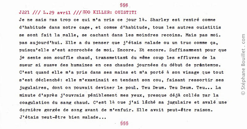 Je ne sais pas trop ce qui m'a pris ce jour là. Sharley est rentré comme d'habitude dans notre cage, et comme d'habitude, tous les autres ouistitis se sont fait la malle, se cachant dans les moindres recoins. Mais pas moi. pas aujourd'hui. Elle a dû penser que j'étais malade ou un truc comme ça, puisqu'elle s'est approchée de moi. Encore. Et encore. Suffisamment pour que je sente son souffle chaud, transmettant du même coup les effluves de la sueur si suave des humaines en ces chaudes journées du début de printemps. C'est quand elle m'a pris dans ses mains et m'a porté à son visage que tout s'est enclenché: elle m'examinait en tendant son cou, faisant ressortir ses jugulaires, dont on pouvait deviner le pouls. Teu Deum. Teu Deum. Teu… La minute d'après j'ouvrais péniblement mes yeux, presque déjà collés par la coagulation du sang chaud. C'est là que j'ai lâché sa jugulaire et avalé une dernière gorgée de sang avant de m'enfuir. Elle avait peut-être raison. J'étais peut-être bien malade…